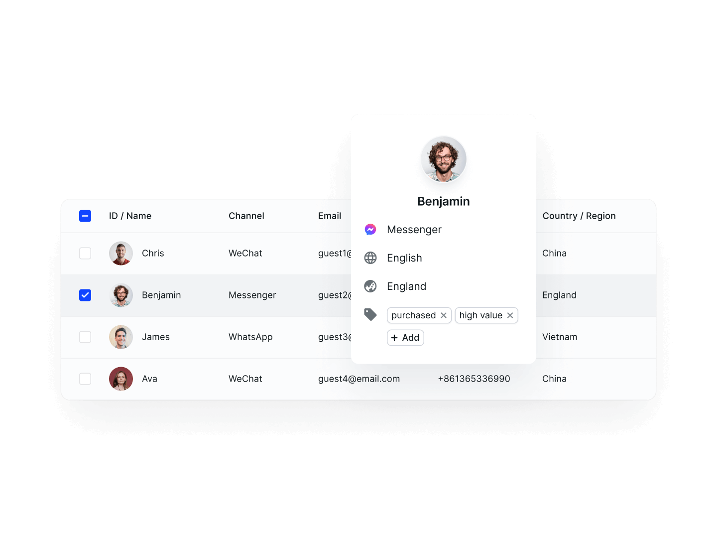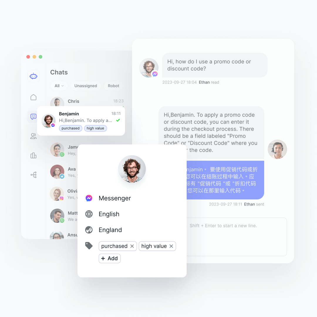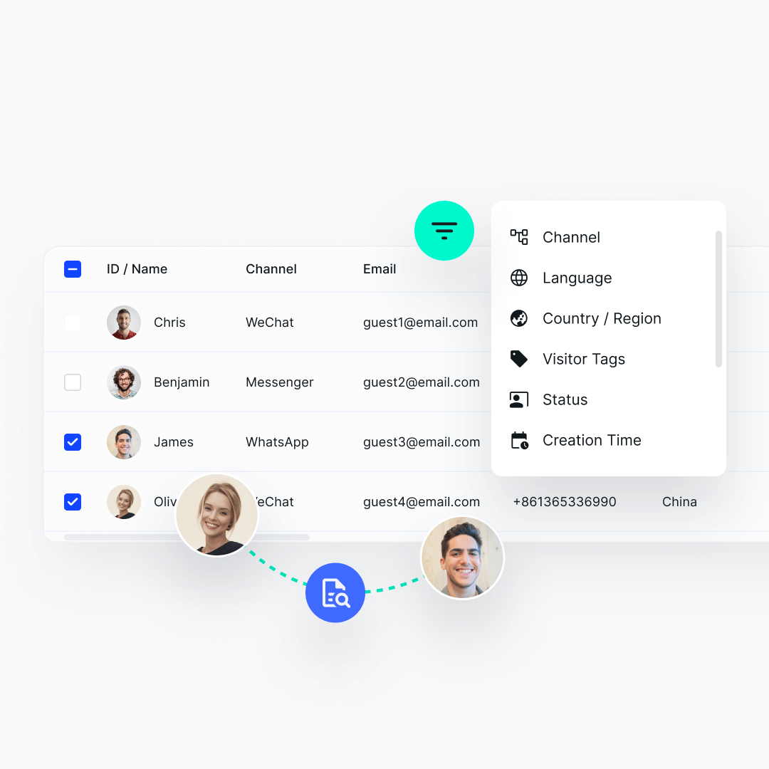 汇总所有客户的渠道信息、个人资料,并查看聊天记录,以便您可以更快、更好地了解客户需求,以增强您与客户之间的关系。